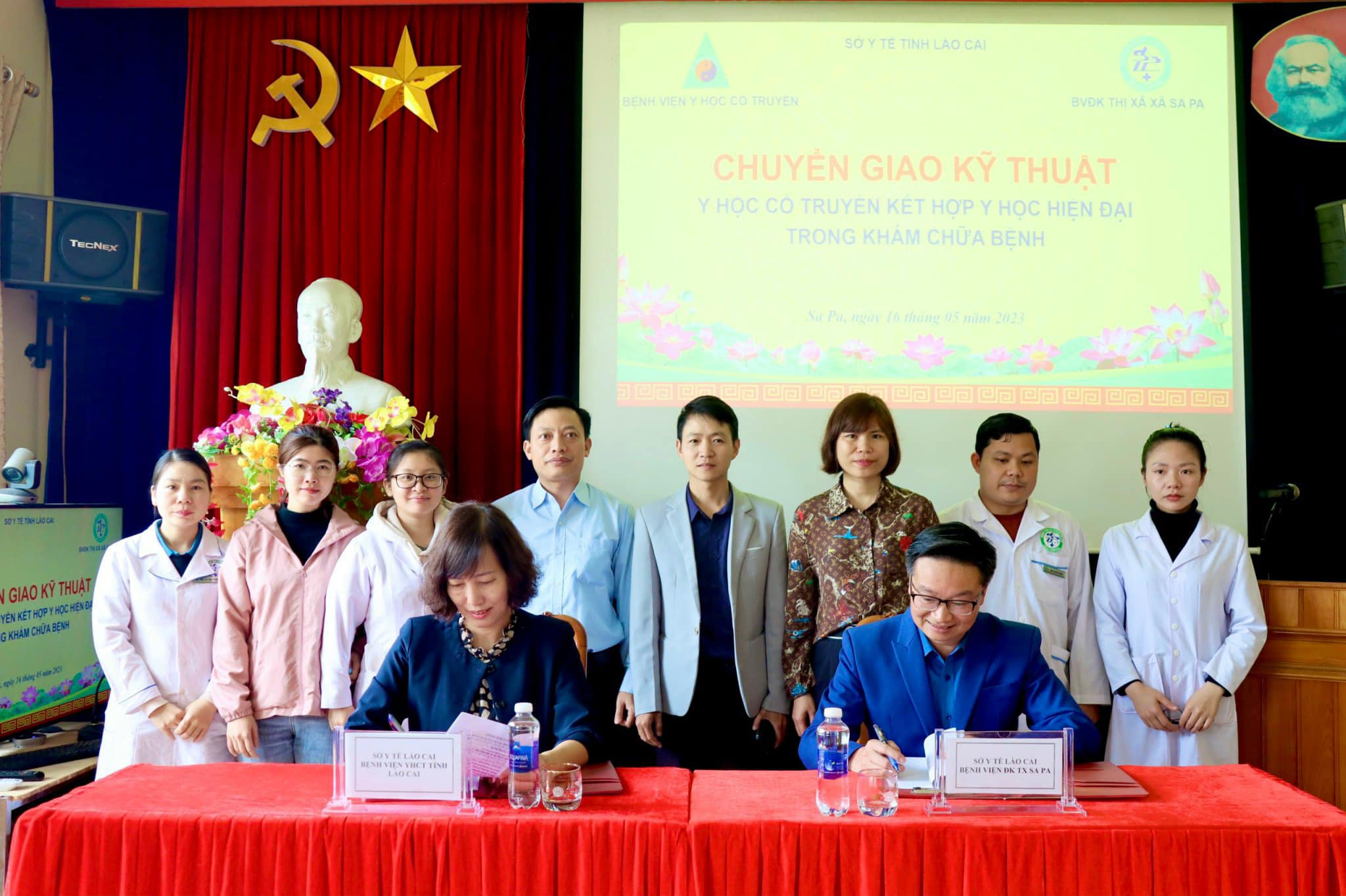 Thực hiện công văn đề nghị giúp đỡ về chuyển giao kỹ thuật của Bệnh viện đa khoa thị xã Sa P, tại Bệnh viện đa khoa thị xã Sa Pa, 2 đơn vị đã thực hiện ký kết chuyển giao kỹ thuật “Cấy chỉ, điện mãng châm trong điều trị bệnh”.